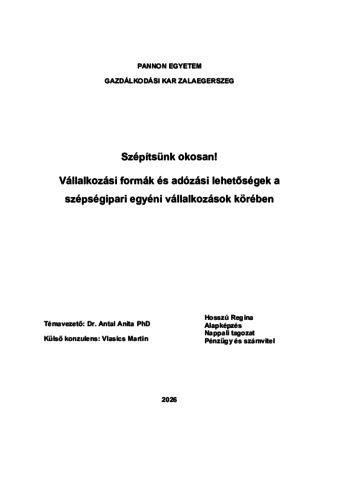 Hosszú Regina (2026) Szépítsünk okosan! Vállalkozási formák és adózási lehetőségek a szépségipari egyéni vállalkozások körében. Gazdálkodási Kar Zalaegerszeg.